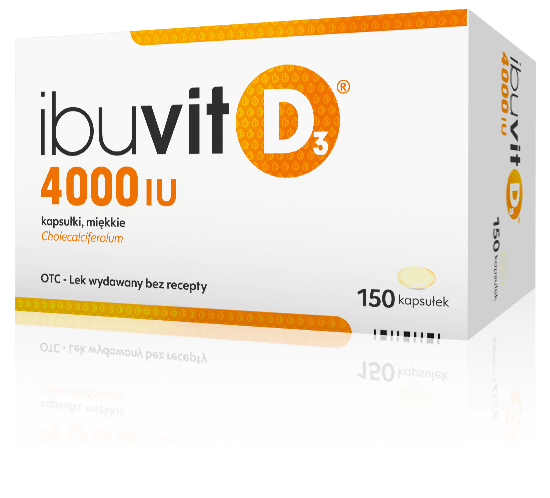 Ibuvit D3 4000 IU. Skład i postać: Każda kapsułka zawiera 100 mikrogramów (4000 IU) cholekalcyferolu (witaminy D3). Kapsułka, miękka. Jasnożółte, owalne miękkie kapsułki (krótsza średnica ok. 7 mm) ze szwem pośrodku, wypełnione jasnożółtym, oleistym płynem. Wskazania: Profilaktyka niedoboru witaminy D i stanów wynikających z niedoboru witaminy D (np. osteomalacja, osteoporoza) u dorosłych z otyłością [wskaźnik masy ciała (ang. body mass index, BMI) ≥ 30]. Podmiot odpowiedzialny: Zakłady Farmaceutyczne Polpharma S.A. ChPL: 2023.06.16.