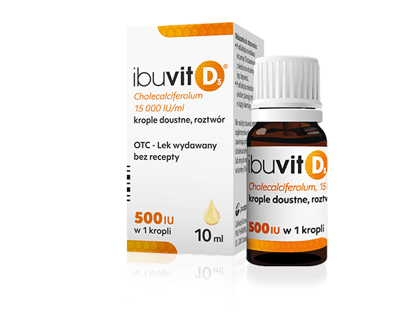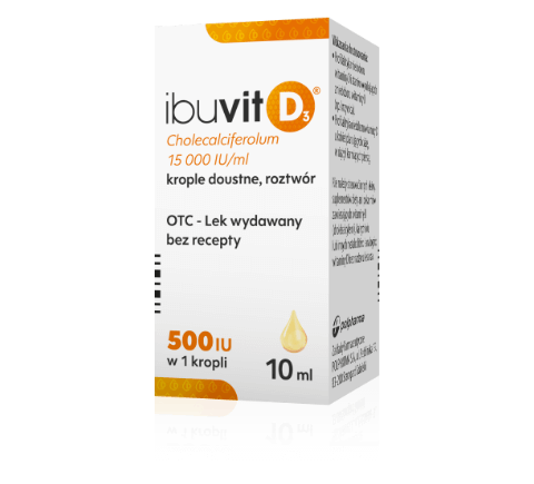 Ibuvit D3 15 000 IU/ml krople doustne. Skład i postać: Każdy ml (około 30 kropli) roztworu zawiera 15 000 IU cholekalcyferolu (Cholecalciferolum) - witaminy D3. Każda kropla zawiera około 500 IU cholekalcyferolu. Krople doustne, roztwór. Roztwór przezroczysty, bezbarwny do jasnożółtego. Wskazania: Profilaktyka niedoboru witaminy D i stanów wynikających z niedoboru witaminy D (np. krzywica). Profilaktyka niedoboru witaminy D u kobiet planujących ciążę, w ciąży i karmiących piersią. Podmiot odpowiedzialny: Zakłady Farmaceutyczne Polpharma S.A. ChPL: 2025.04.04.